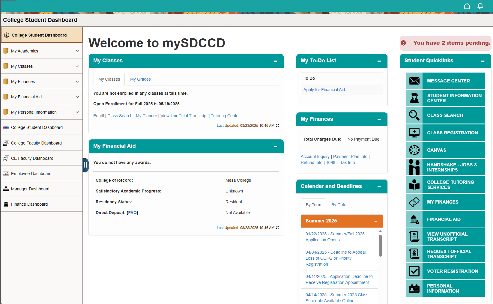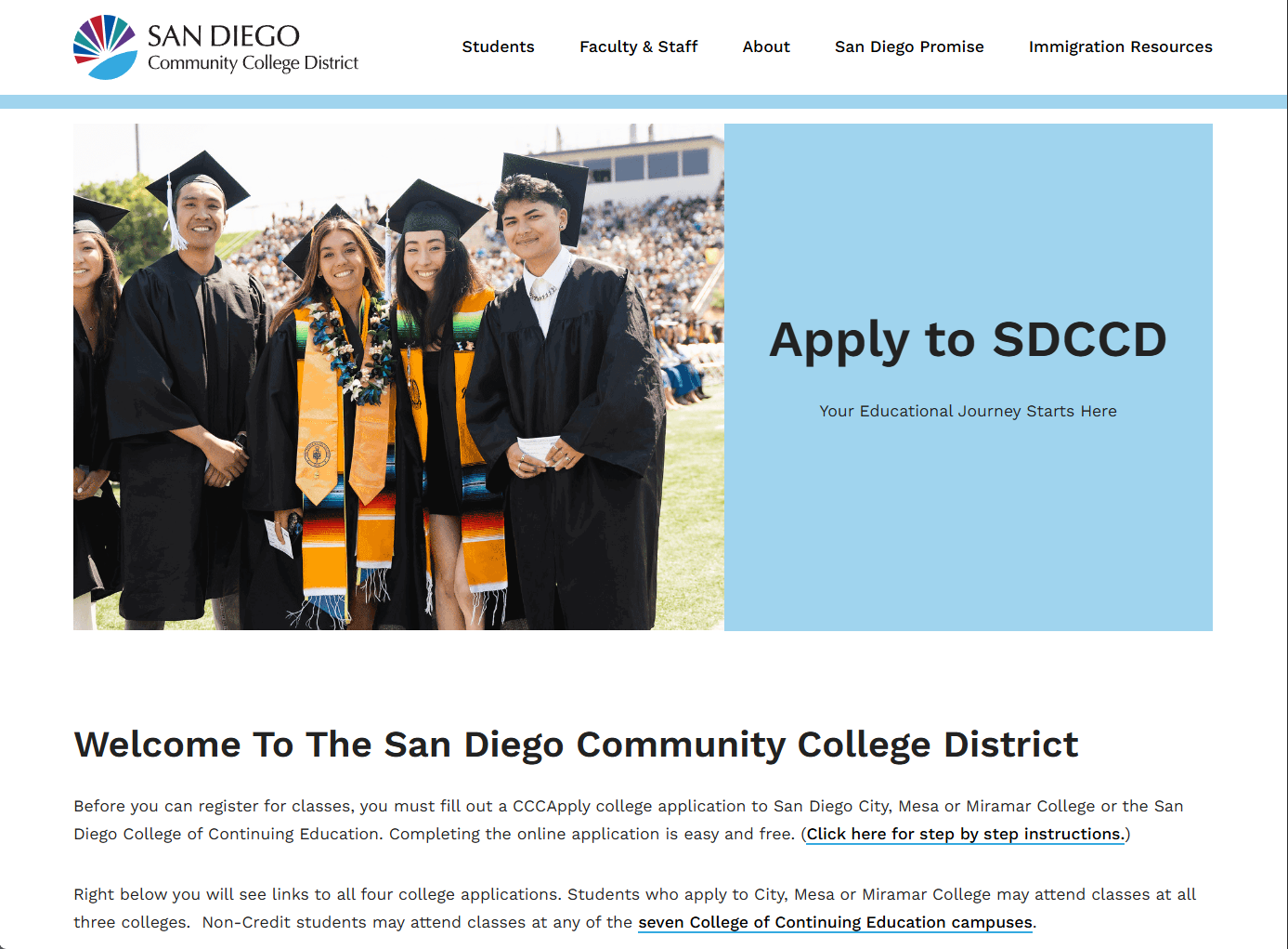 mySDCCD is the portal for admissions, student records, financial aid, employee resources and more. It's your one-stop show for everything SDCCD. Use the links below to access mySDCCD, Canvas, the Class Schedule and more.