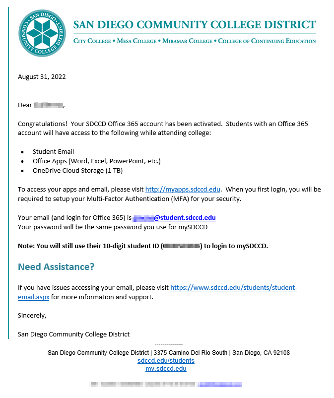 - After applying to one of the Colleges of City, Mesa, Miramar or Continuing Education you will recieve an email with your student email and temporary password.
